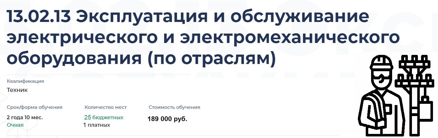 Специальность 13.02.13 Техническая эксплуатация и обслуживание электрического и электромеханического оборудования – это квалифицированные специалисты, которые осуществляют ремонт устройств электроснабжения. Они предотвращают или устраняют неполадки в электрических приборах, проводят профилактические осмотры электрических аппаратов, производят измерения и электрические расчеты, изготавливают электротехнические схемы монтажа и сборки. Обеспечение бесперебойной работы электрооборудования является основой для эксплуатации любых зданий – промышленных, административных, жилых и офисных.